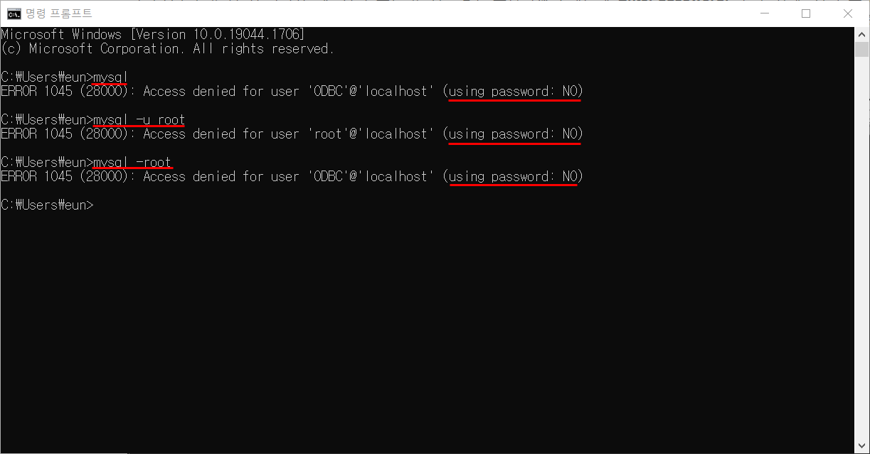 만약 잘못 입력한 실행문에 '-p'가 포함되어 있지 않은 경우에는 비밀번호 입력 과정 없고 에러 문구에 (using password: NO)가 표시된다.
