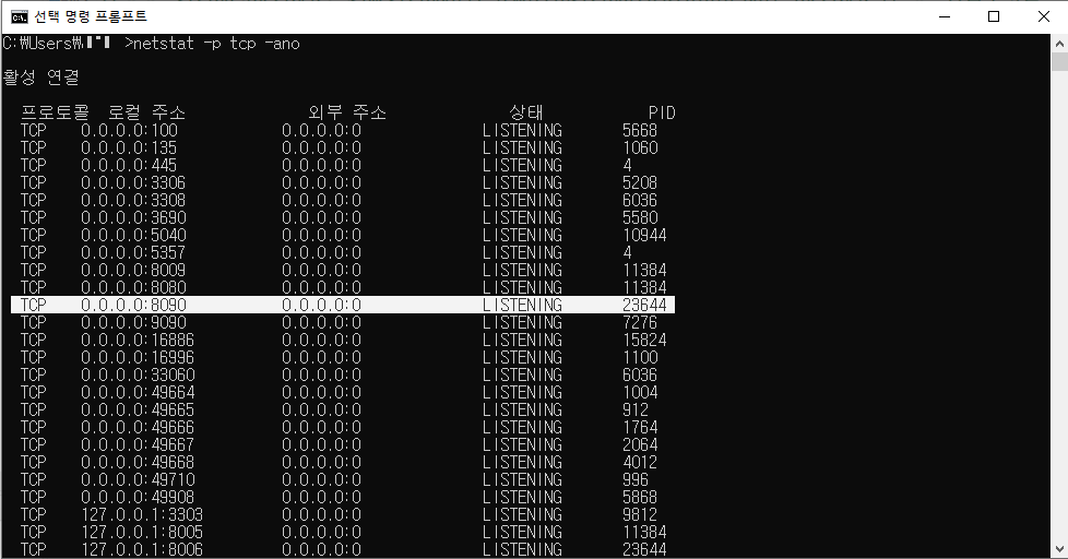본인은 톰캣 포트로 8090을 사용하고 있으므로 해당하는 PID는 23644이다.