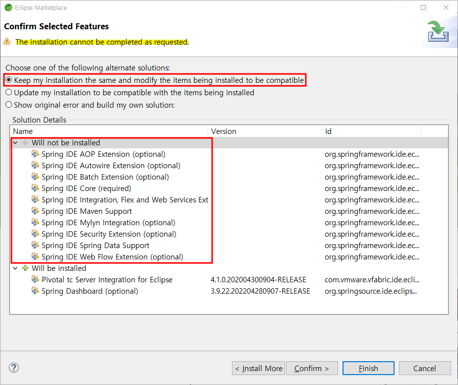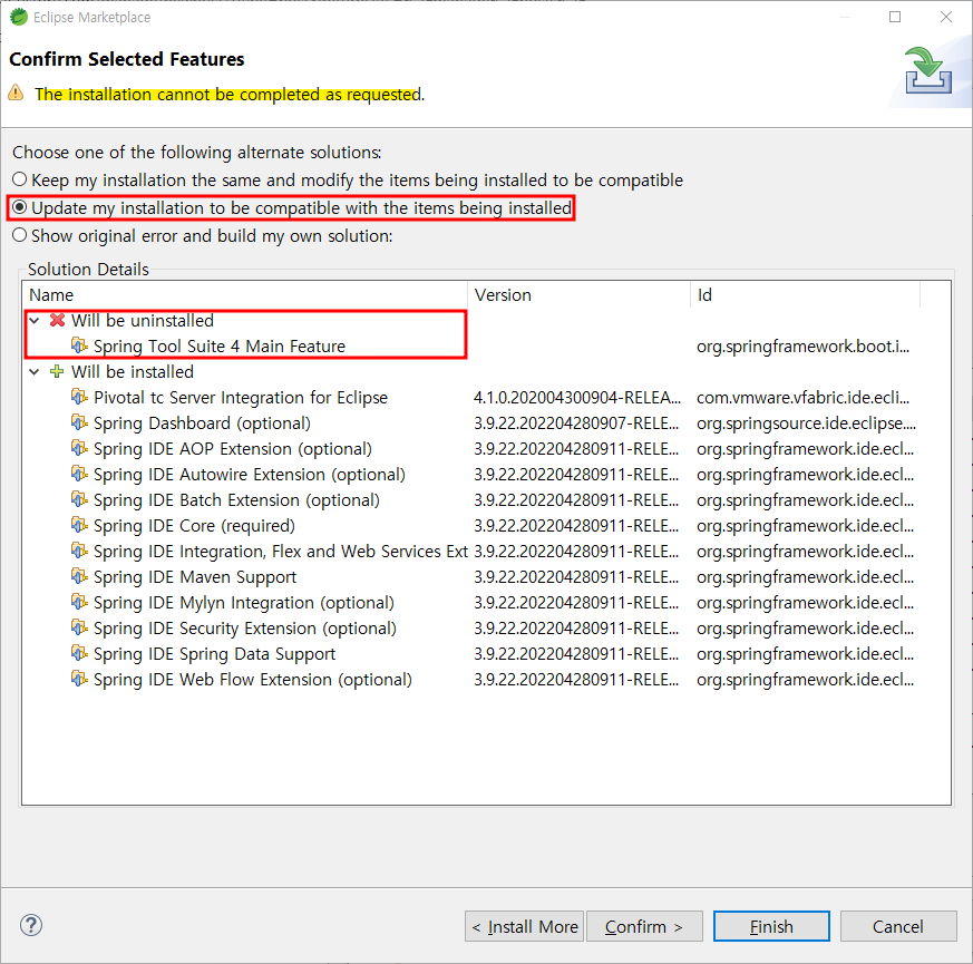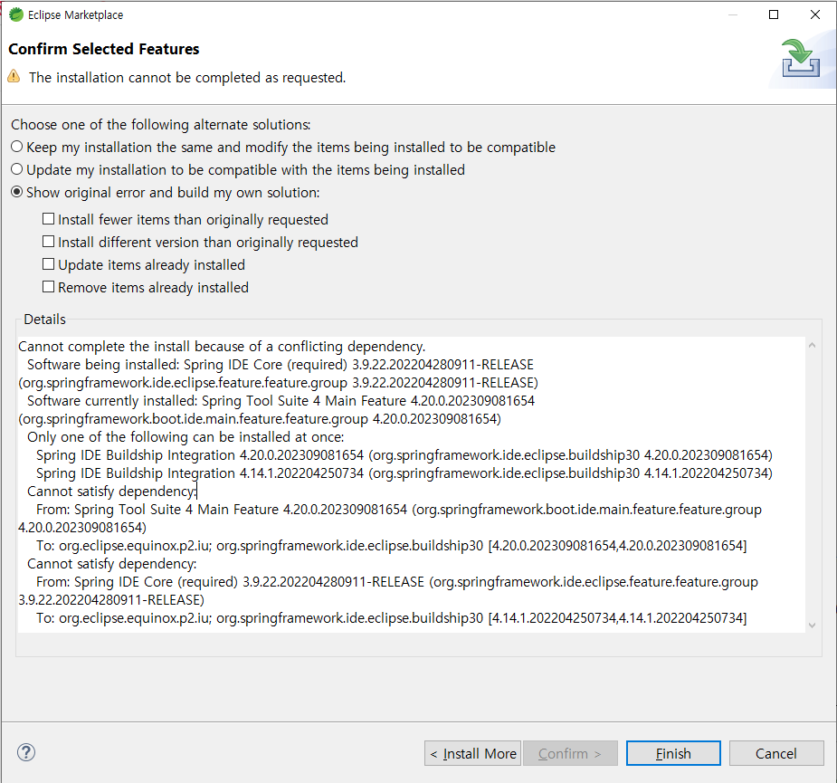 에러 문구를 살펴보니 종속성 충돌 때문에 Spring Tools 3 혹은 4 둘 중 하나만 설치가 가능한 듯 했다.