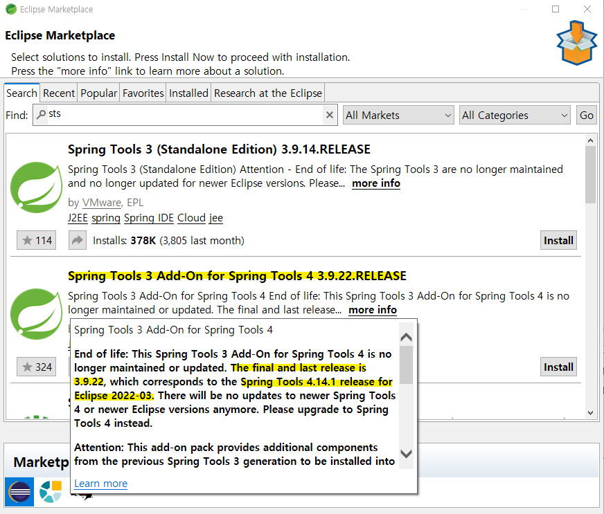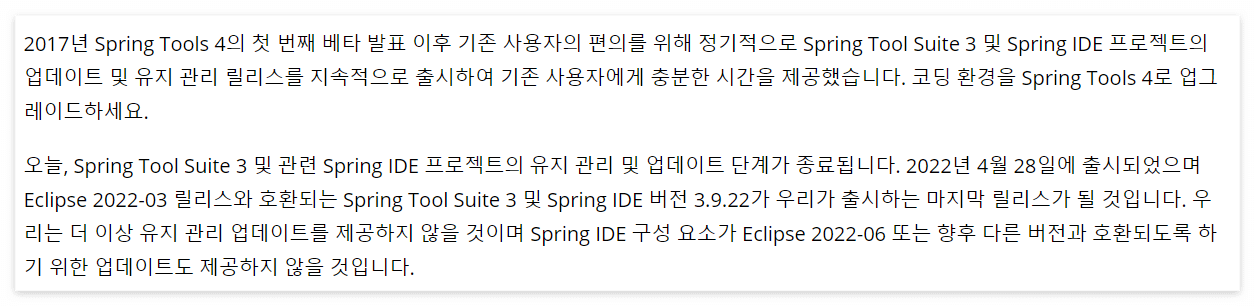 3.9.22 버전을 끝으로 Spring Tools 3 Add-On for Spring Tools 4에 대한 업데이트는 없다는 내용이다.