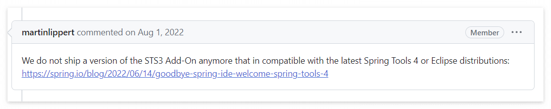 그에 대해 '더이상 Spring Tools 4 최신 버전과 호환되는 STS3 Add-On 버전을 지원하지 않는다'는 답변이 올라와있다.