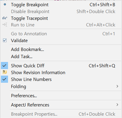 코드 편집기의 해당 라인번호 왼쪽 빈공간을 더블클릭하거나 우클릭 후 Toggle Breakpoint 를 선택한다. 코드 내용이 없는 빈 줄에는 Breakpoint를 생성할 수 없고 코드가 적힌 라인에 생성 가능하다.