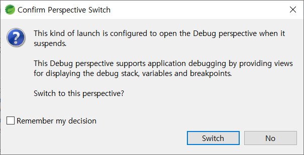 디버그 모드 실행 후 Breakpoint를 만나면 디버그 창으로 전환할지 묻는 창이 뜬다.