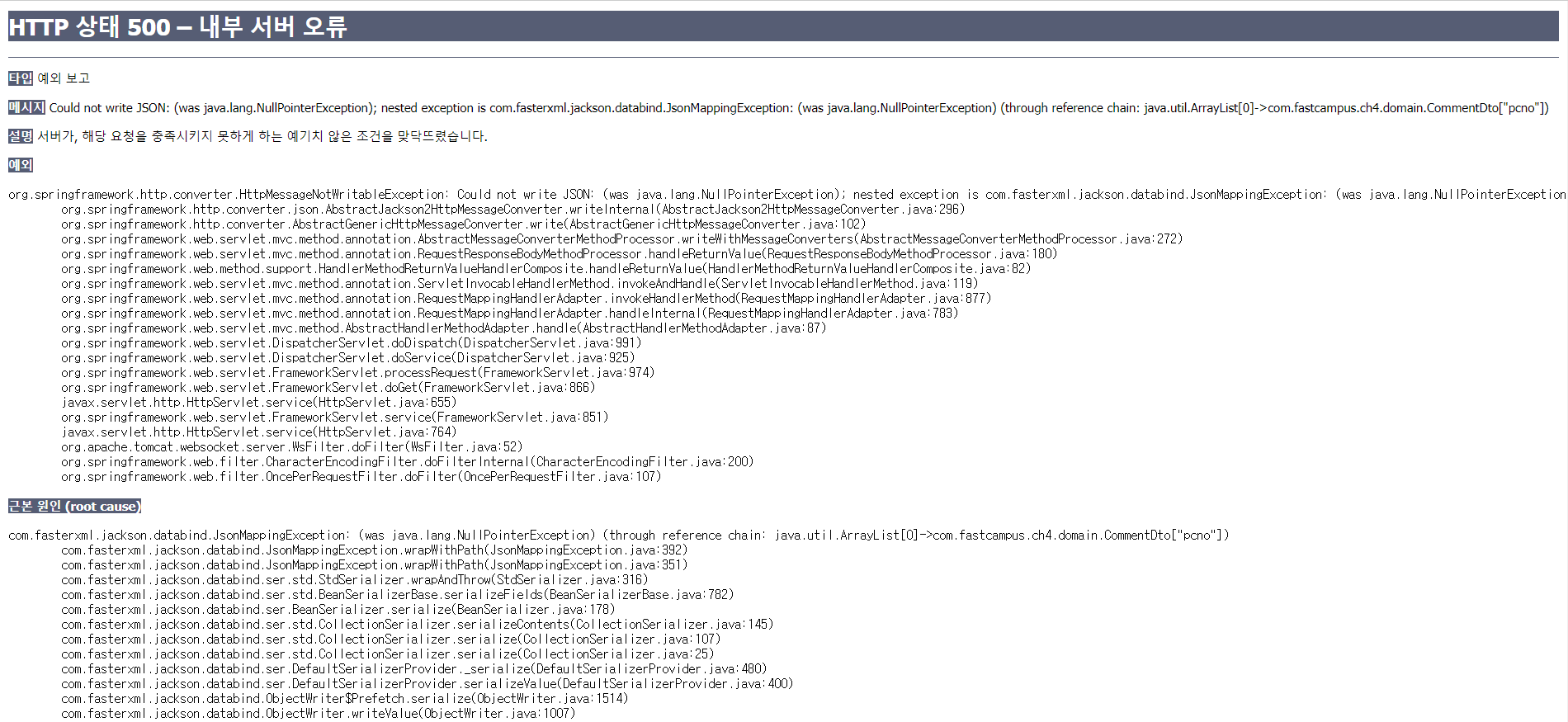 org.springframework.http.converter.HttpMessageNotWritableException: Could not write JSON: (was java.lang.NullPointerException); nested exception is com.fasterxml.jackson.databind.JsonMappingException: (was java.lang.NullPointerException) (through reference chain: java.util.ArrayList[0]->com.fastcampus.ch4.domain.CommentDto["pcno"])