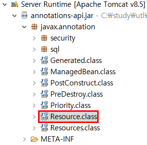 @Resource는 annotaions-api의 javax.annotation 패키지 내에 있기 때문에 pom.xml 파일에 따로 dependency를 추가하거나, 톰캣 라이브러리를 추가해야 사용 가능하다. 톰캣 라이브러리를 추가했을 경우, 해당 라이브러리에서 Resource.class를 확인할 수 있다.