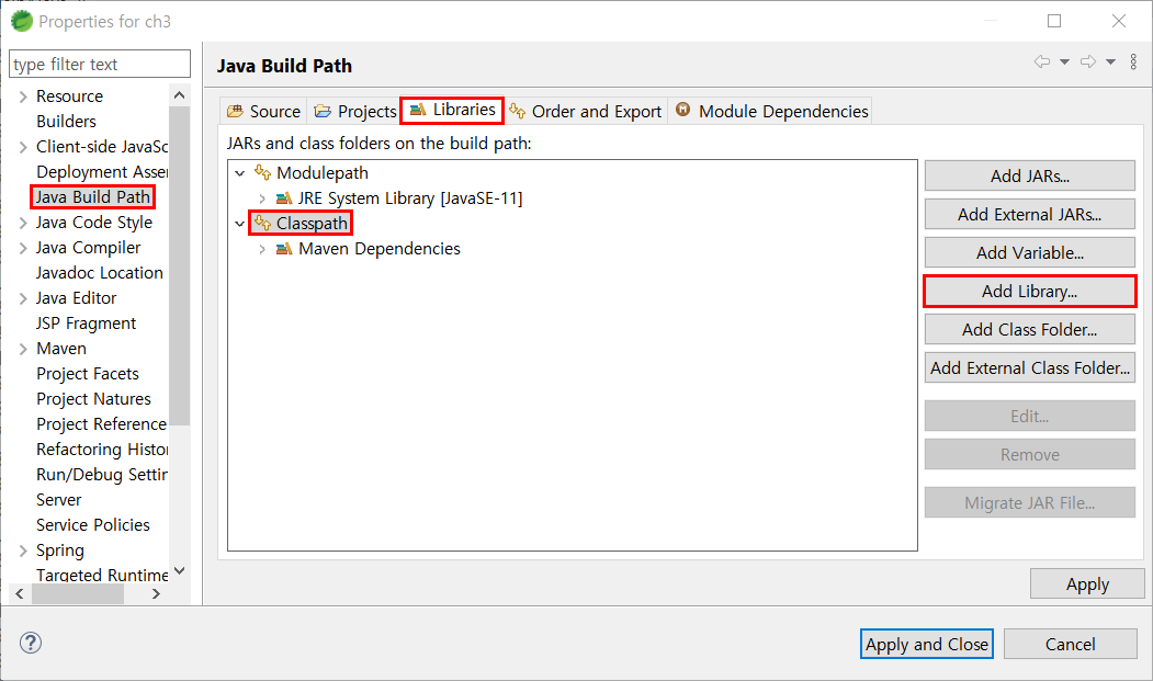 2. Java Build Path 🠒 Libraries 🠒 Classpath 선택 🠒 Add Library 클릭